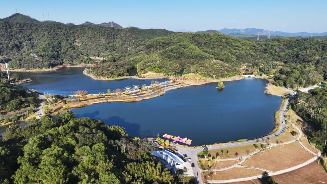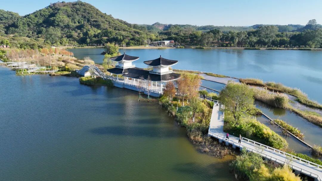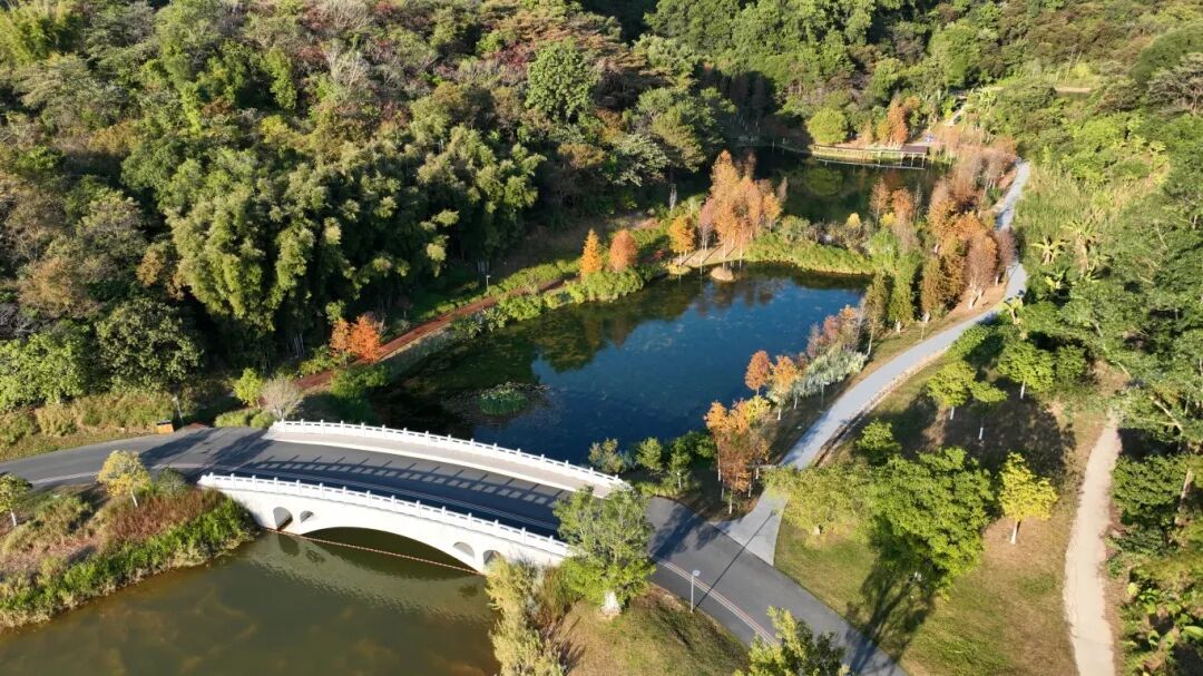 迳下水系连通,营造出山林、湖泊、溪流、湿地等多种水陆生境,招引鹭鸟、水鸡、野鸭等多种生物栖息;完成迳下水系景观绿化148亩,在保护原生植被的基础上,种植无忧树、凤凰木、落羽杉、乌桕等32种乔木共1652棵,簕杜鹃、山茶花、野牡丹等29种灌木共9539株;打造多彩林示范段,形成水绿交融的多层次立体绿化格局。