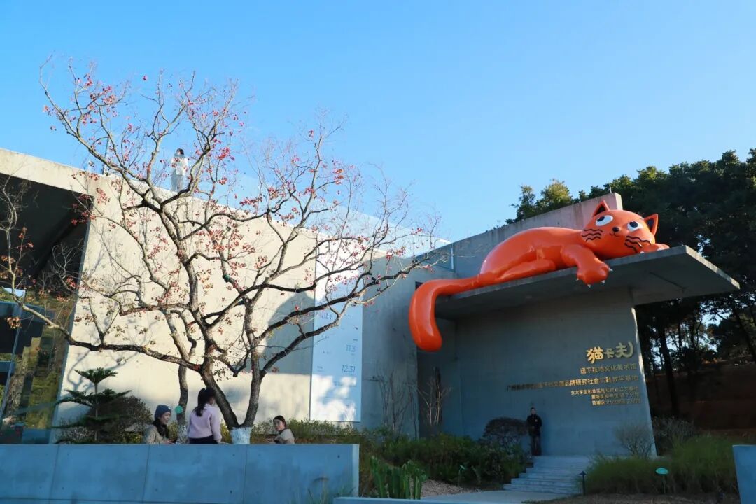 在风景优美的迳下东湖旁,坐落着一座充满艺术感的建筑,外墙上趴着的橙色大猫彩塑格外引人注目。这是才开馆2个月的黄埔区图书馆猫卡夫艺术分馆,建筑面积约1000平方米,融合了“猫式生活哲学”与卡夫卡文学哲思,是一处兼具人文温度与美学价值的文化栖息地。