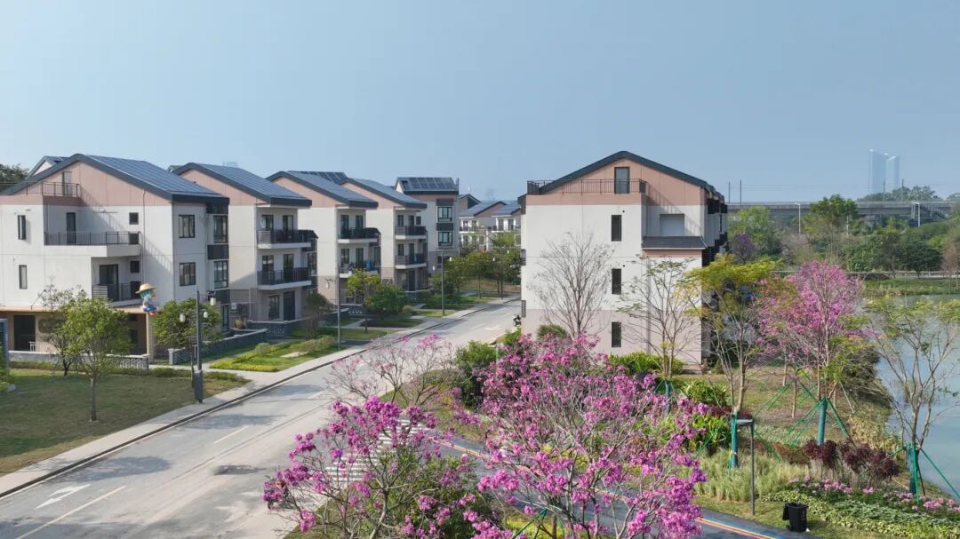 这些小别墅别致新颖,简洁开敞的阳台,屋顶整齐排列的太阳能板在阳光下闪耀。温暖的冬日阳光轻柔地洒下,波光粼粼的河水,与小别墅相互映衬。蜿蜒的水体与道路并肩前行,几株粉樱点缀其间,远处青山如黛,植被茂密,从高处俯瞰,满眼皆是“绿树村边合,青山郭外斜”的和谐画面。